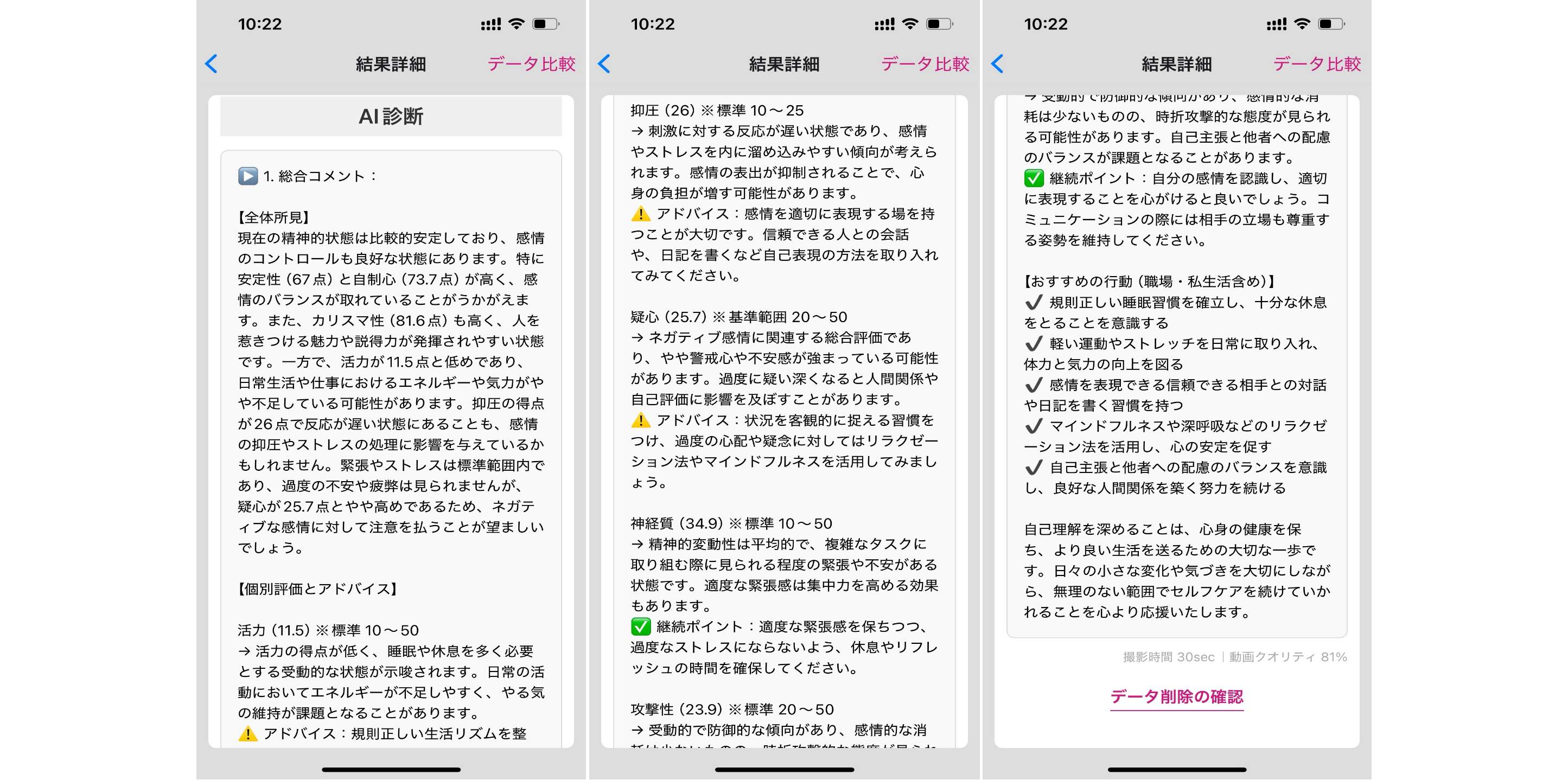10の評価要素(ストレス、安定性、自制心、緊張、カリスマ性、抑圧、攻撃性、疑心、活力、神経質)に基づき、AIが精神状態を診断します。総合コメントと個別評価・アドバイスを提示します。 |