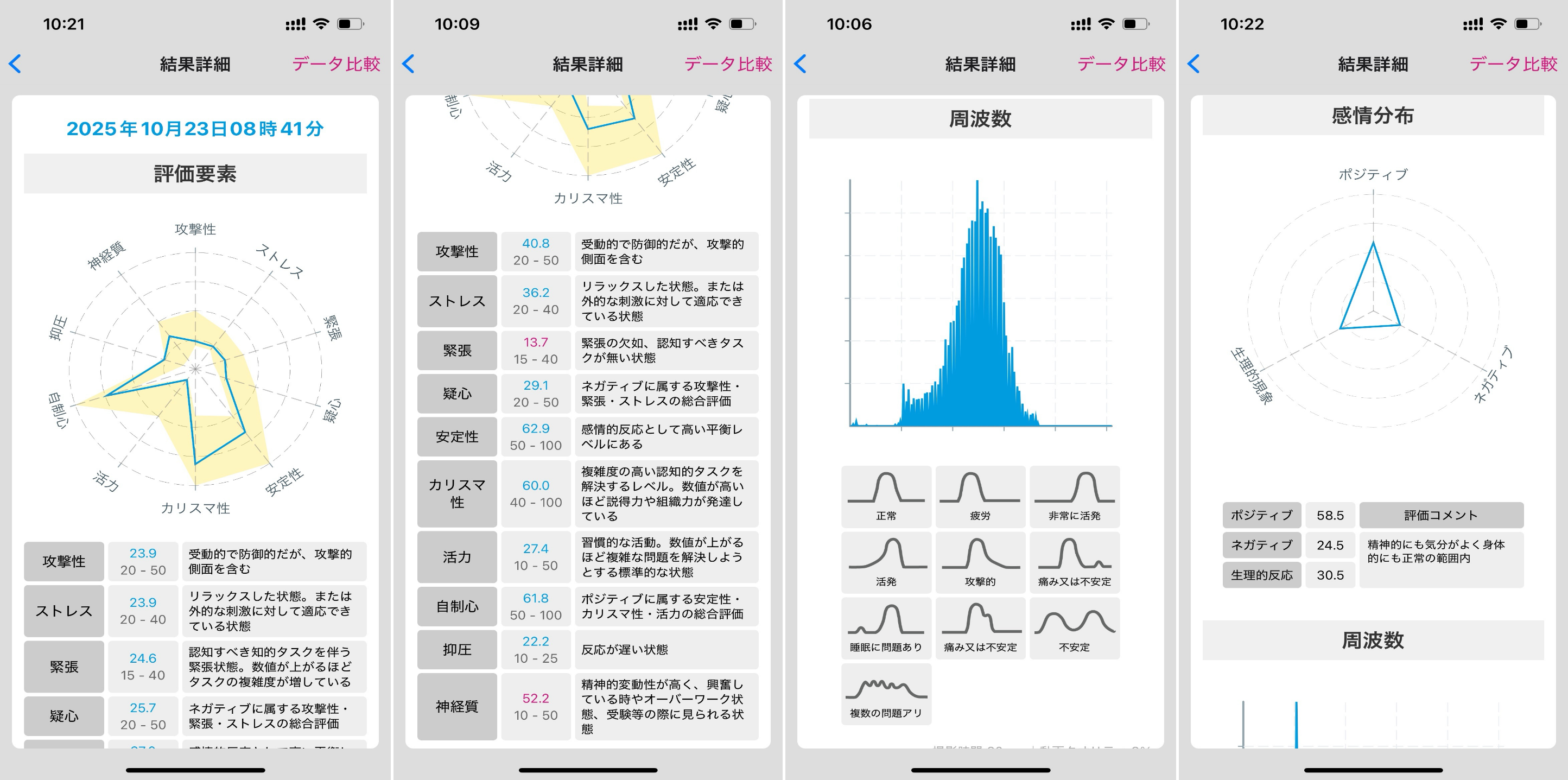 測定完了後、診断結果をアプリ上で確認できます。評価要素ごとの数値と標準範囲が表示されます。結果の詳細やデータ比較が可能です。 |
